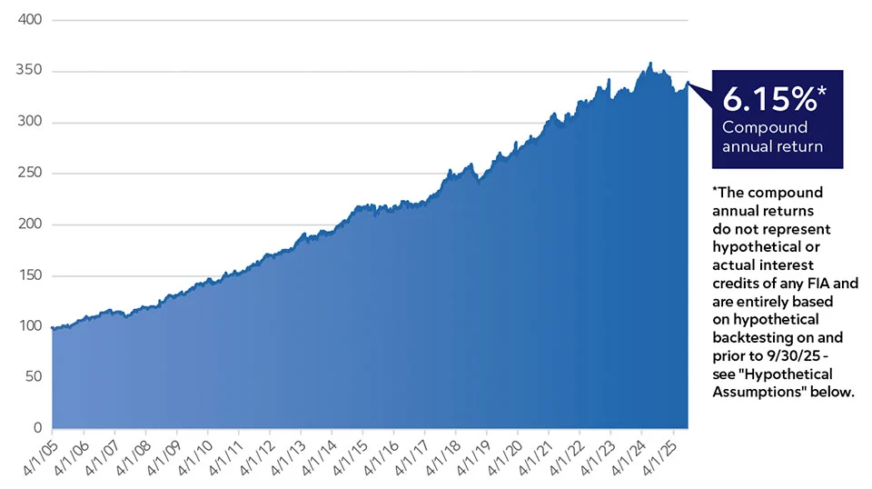 *Hypothetical Assumptions: Back-tested performance of the RAFI Harvey GS Index (the “Index”) from 4/1/05 to 9/30/25. The Index was established on 9/30/25. Back-tested performance is for illustrative purposes only. There is no assurance or guarantee that the Index will operate or would have operated in the past in a manner consistent with the back-tested performance. Such simulated performance data has been produced by the retroactive application of a back-tested methodology and may reflect a bias towards strategies that have performed well in the past. You should carefully consider the assumptions, limitations and potential biases of the back-testing process when evaluating any hypothetical performance data. No future performance of the Index can be predicted based on the simulated performance or the historical returns described herein. Performance figures are net of servicing costs (based on notional positions) and rebalancing costs (based on turnover). For more information about the Index, including certain assumptions underlying backtested performance and costs, see the Index Methodology and other materials available at https://www.goldmansachsindices.com/products/RAHARVEY. The foregoing performance information does not include any relevant costs, participation rates, and charges associated with the product.